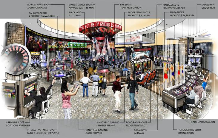 Well if you click on the picture at the top, you can see AGEM’s futuristic casino layout, which includes everything from dancing slots to group play games. Judging from the picture, which also appears in Vegas Inc., casinos will be more vibrant places that provide a wide variety of options.